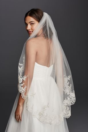 En vogue bridal accessories & wedding veils style: Especially when it comes to a lace edge wedding veil. Top layer plain tulle 31 inches bottom layer with lace 40 inches. If you're wearing a dress with allover embellishments, you may choose to match your wedding dress with an ornate veil, or alternatively, pair it with a simple veil to highlight the details of the dress. Lovely short wedding dress features in tulle and chiffon.